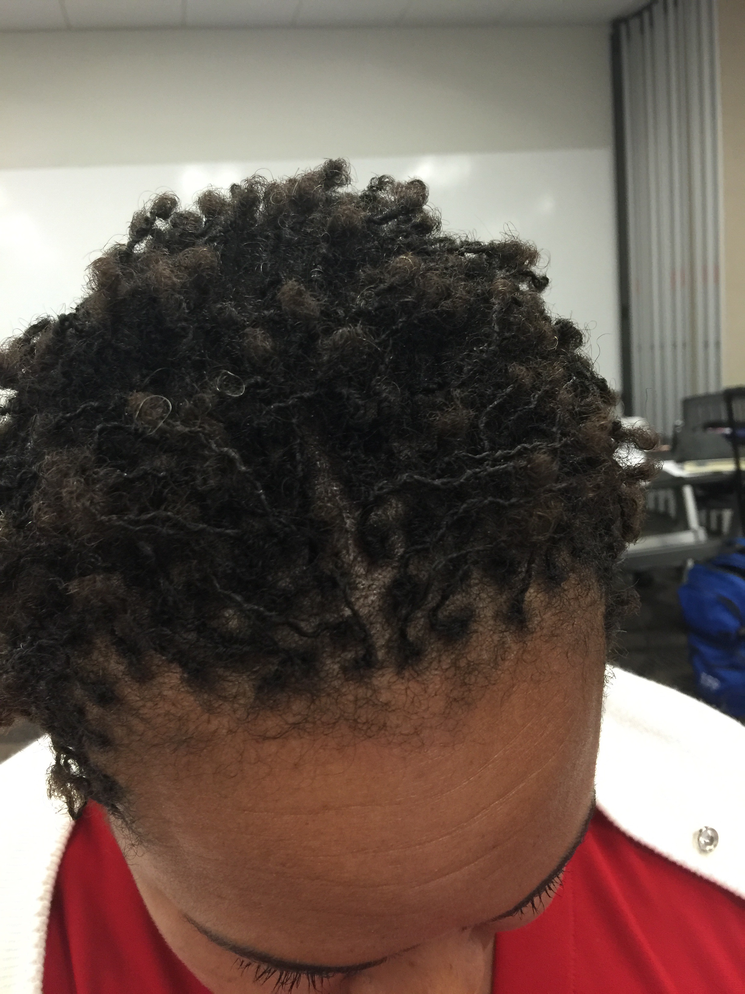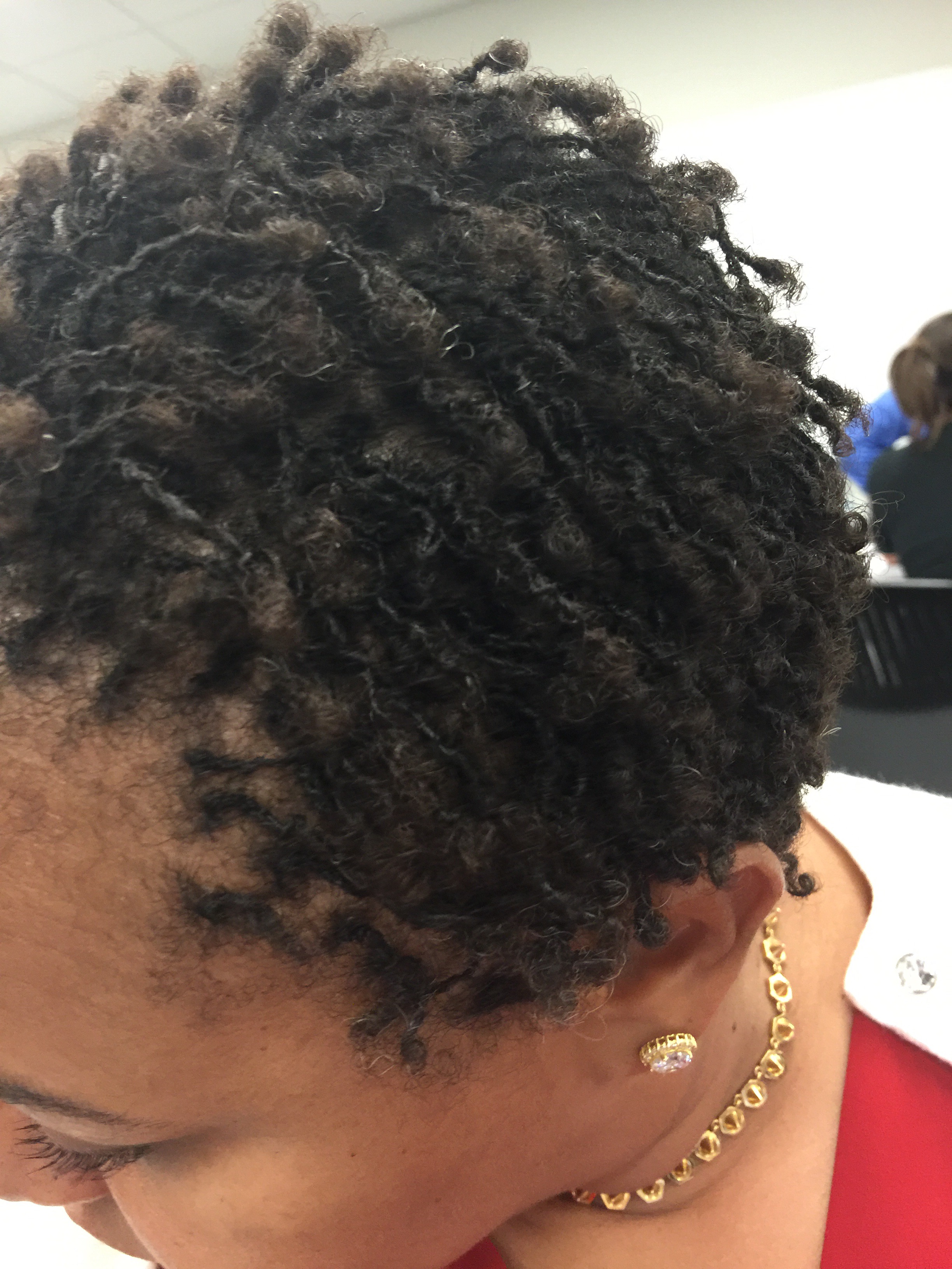 On Thursday, July 28, I took several photos of my hair, during a brief break at work, to include in this week’s blog entry. What is most noticeable are the little “buds” forming on the ends that look like “hair balls.” I’m sure there is a technical term for it, but through the eyes of a newbie, they look like little fur balls. 😁 The spacing seems less obvious to me, after four days. I’ve been following my consultant’s directions, namely wearing my Loc Soc while I sleep and under no circumstances getting my head wet. You may be wondering why it is important for my hair to remain dry. At this stage, my baby locs are too immature to sustain water which will cause them to unravel or increase the chances of slippage (unraveling). Indeed, the time and financial investment is just too great to be frivolous about maintenance of my baby locs.