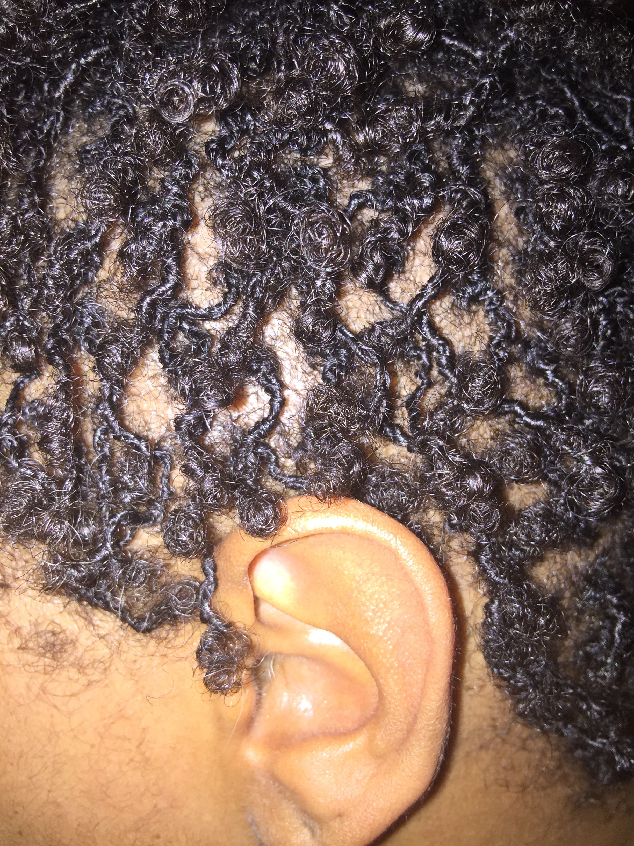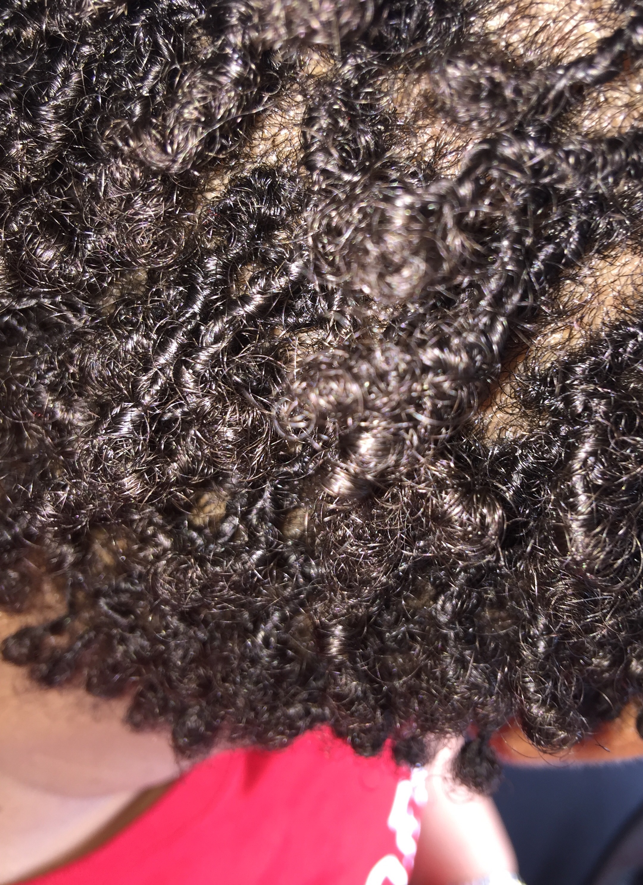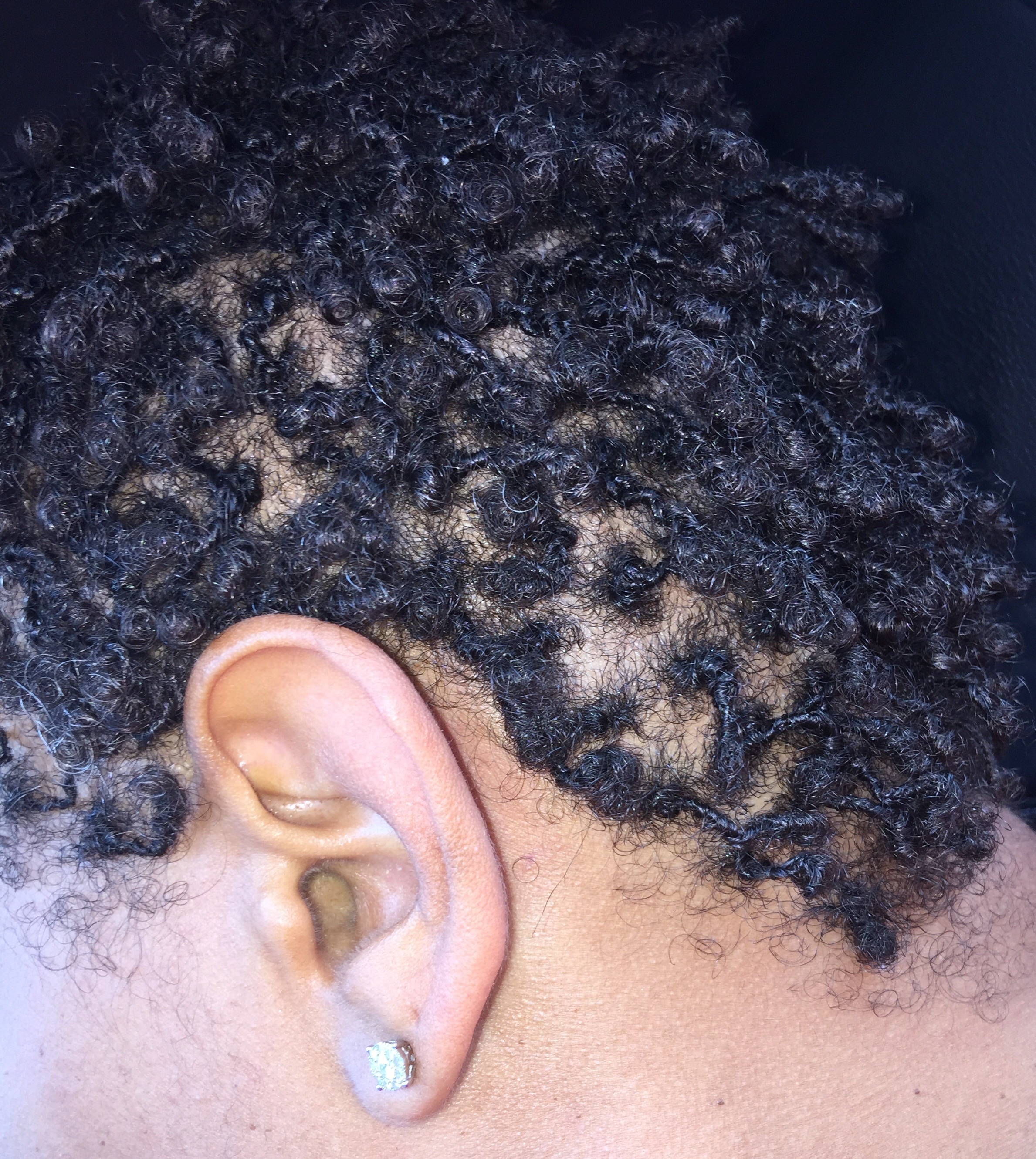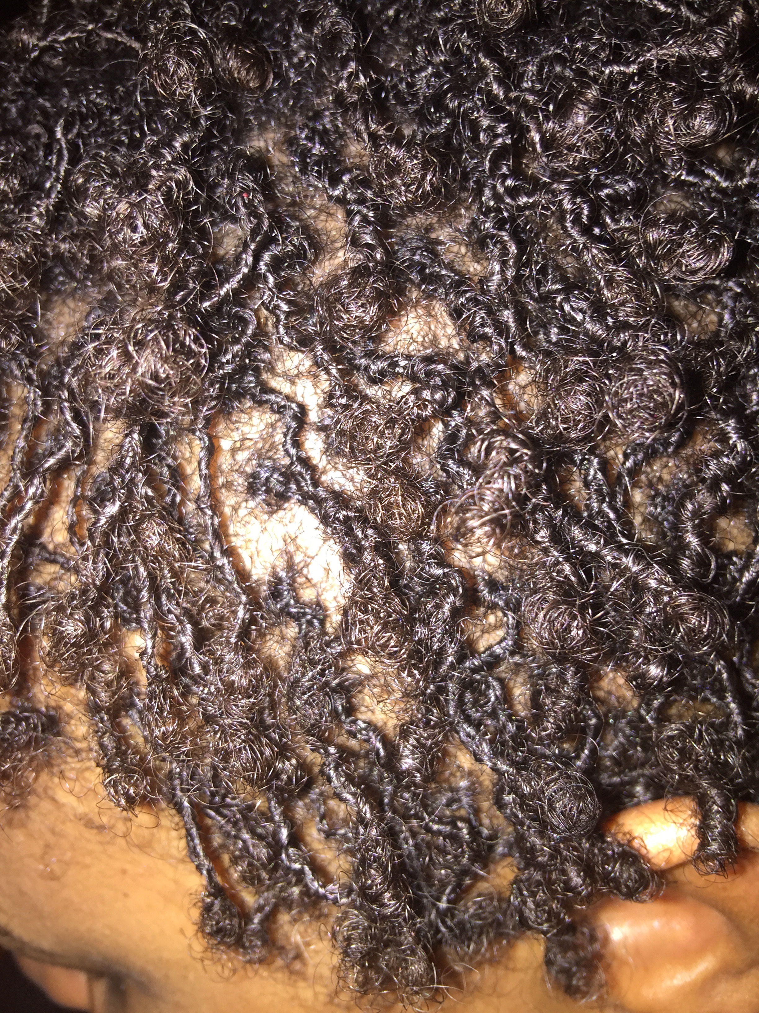 By Friday, July 29, the itching has subsided. I was sure to use a flash to get a better look at the texture of my hair. My hair seemed a bit more “spacey” today; interesting that the flash magnifies this effect, but my hair does not look this sectioned when I look at it in the mirror. The individual locs appear to be a bit stringier today, too. See what I mean…?