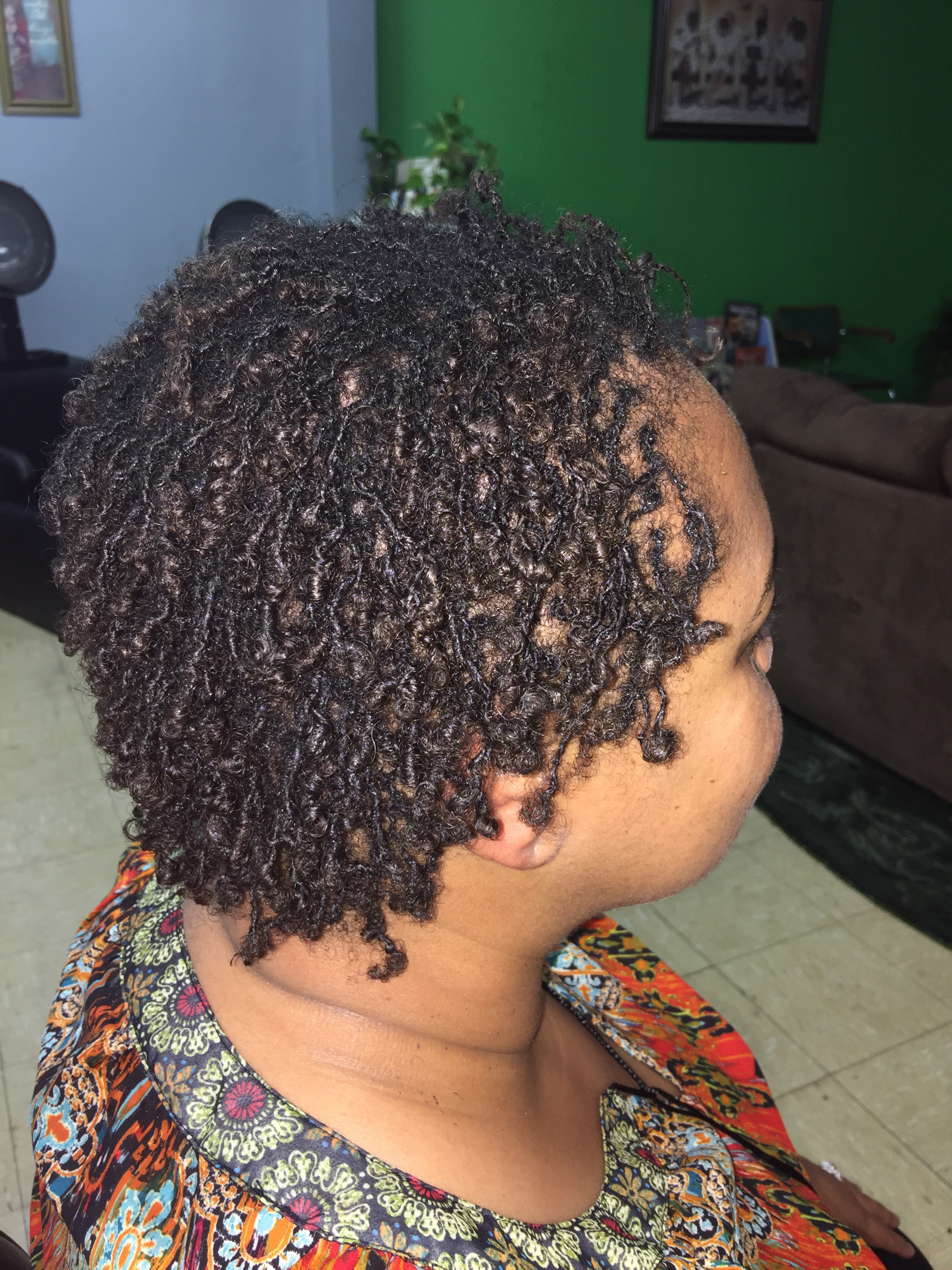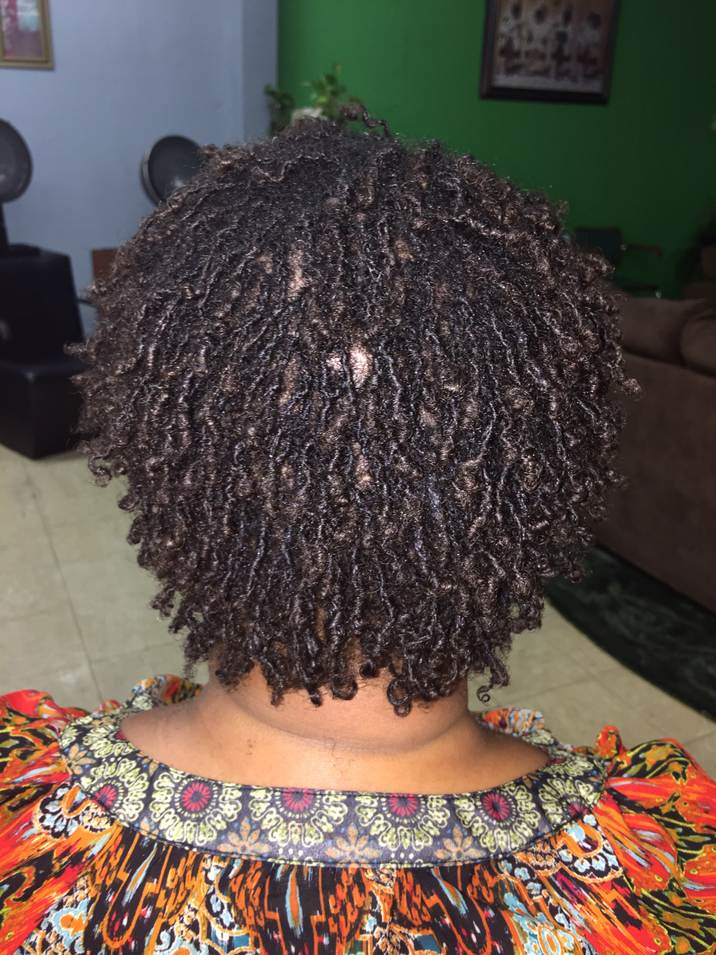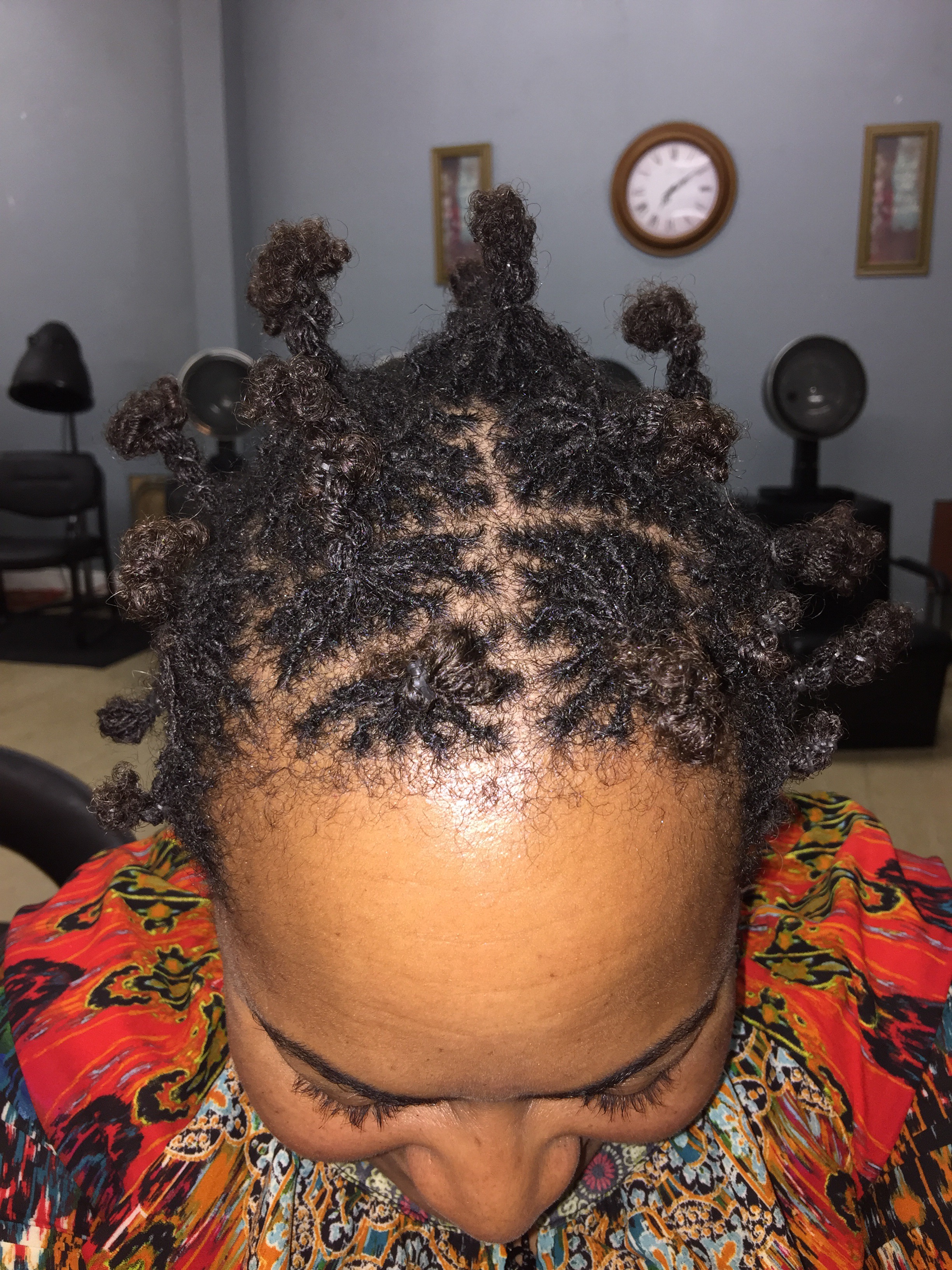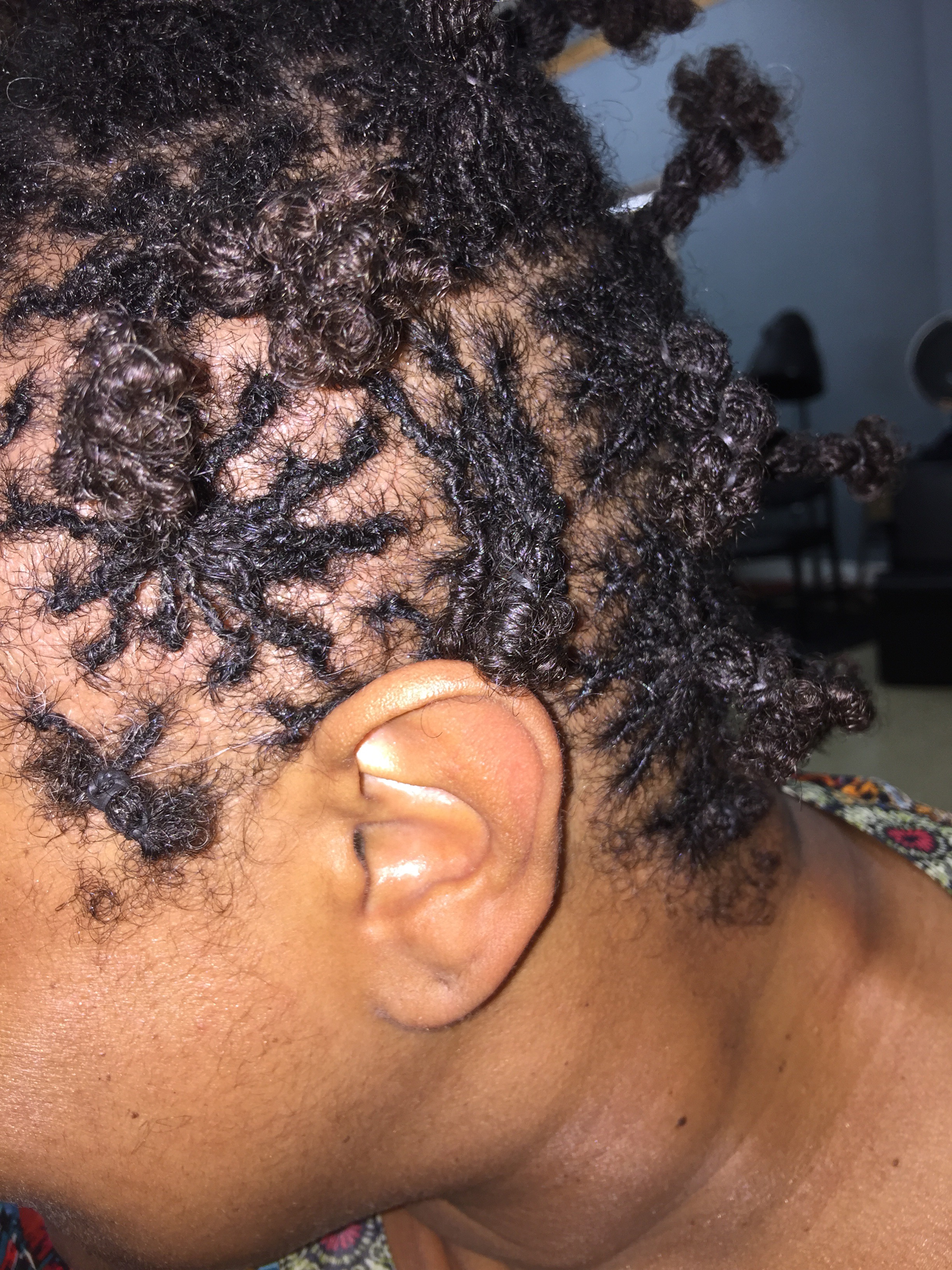 Almost two hours later, my hair is completely retightened and bundled & banded for shampooing. This time we retightened first, before shampooing. For the first retightening, we retightened most and finished some edges after shampooing.